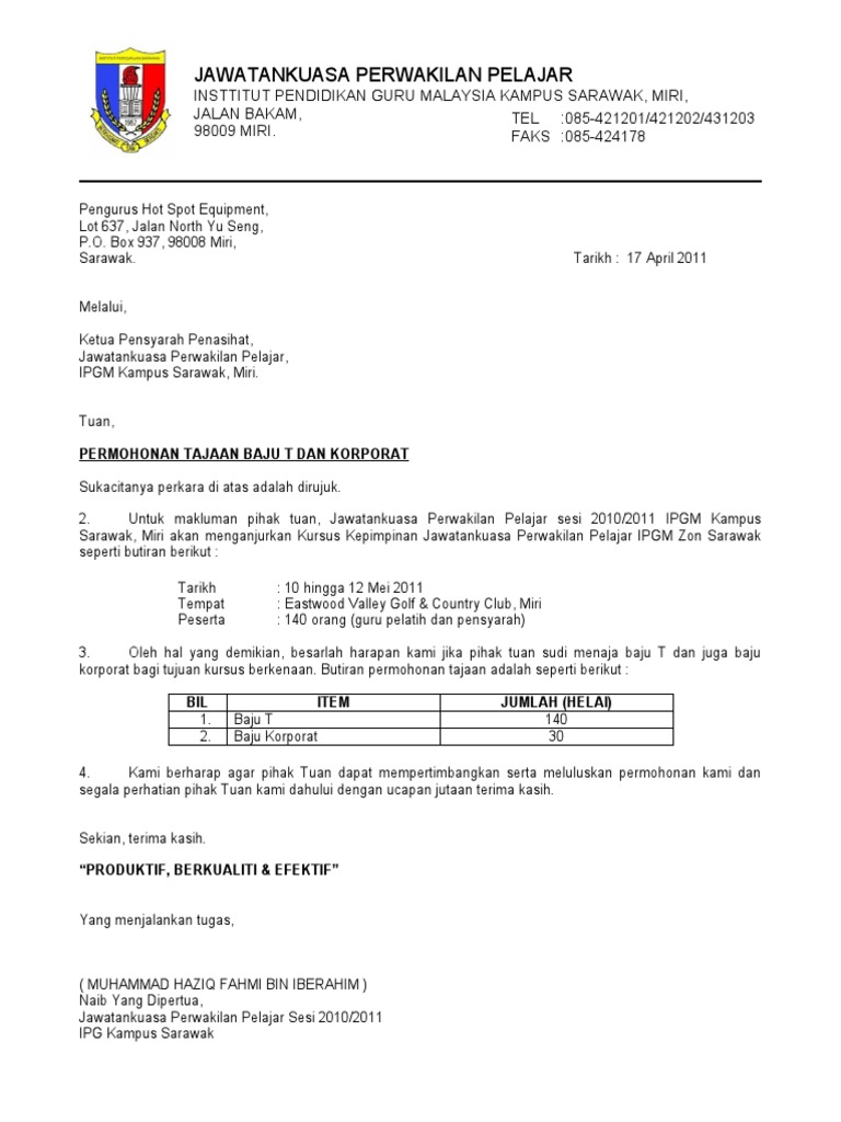 Contoh Surat Rasmi Permohonan