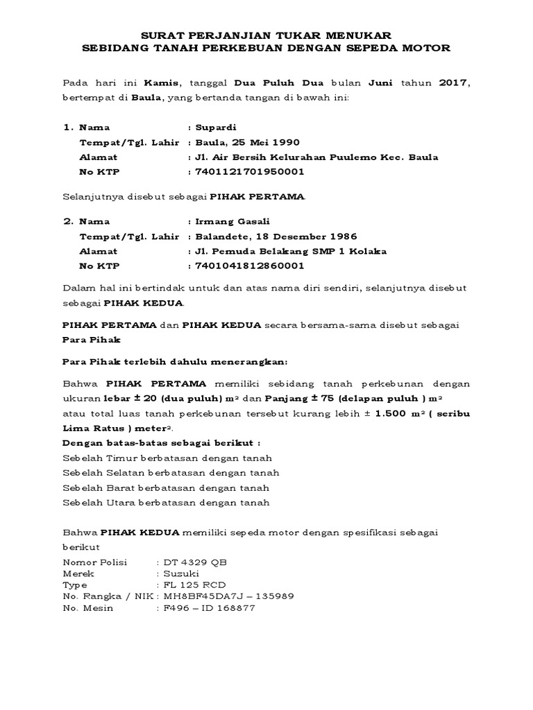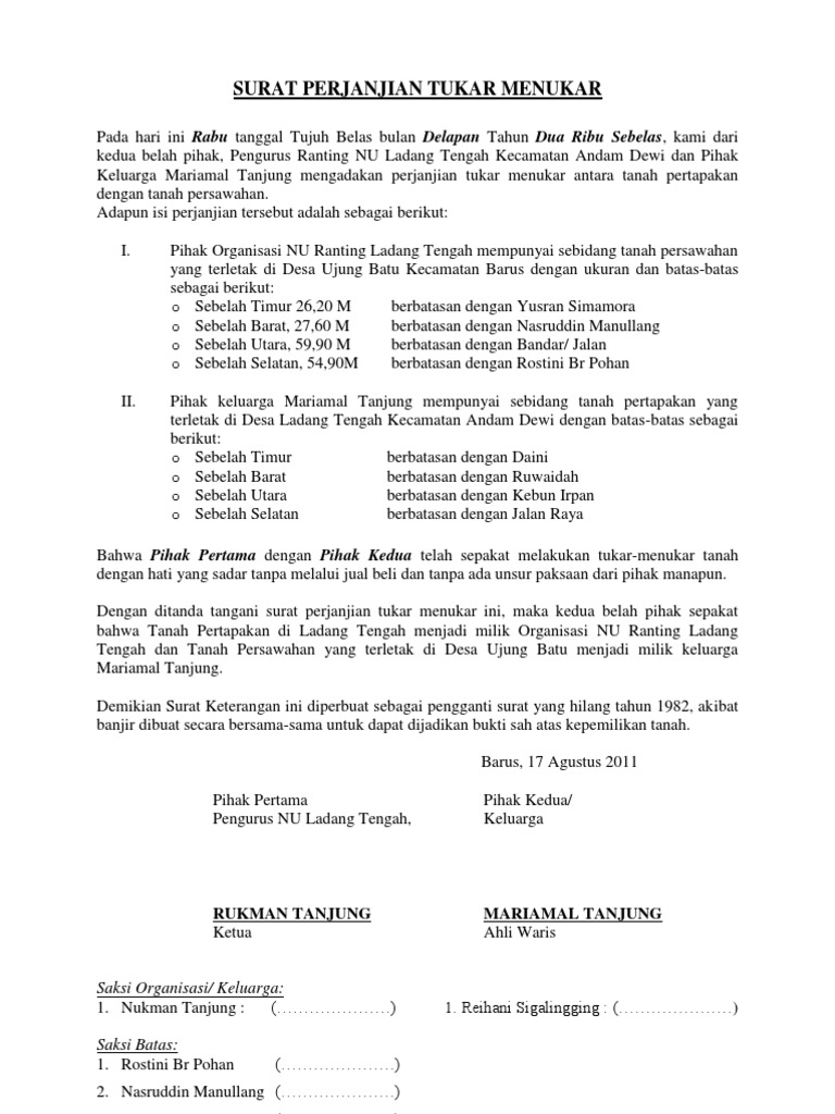 Contoh Surat Perjanjian Tukar Menukar Tanah Kumpulan Surat Penting