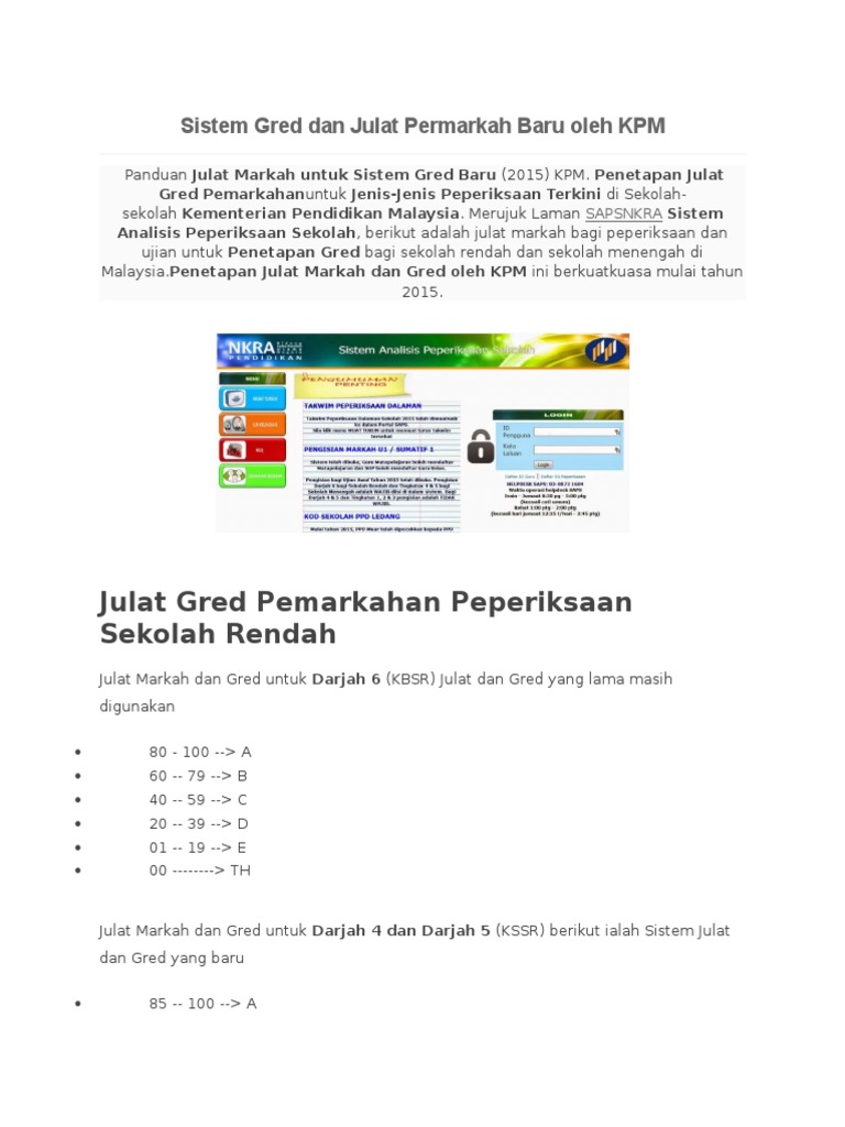 Gred Pemarkahan Peperiksaan Di Sekolah Bagi Tahun 1 Hingga Tingkatan 5