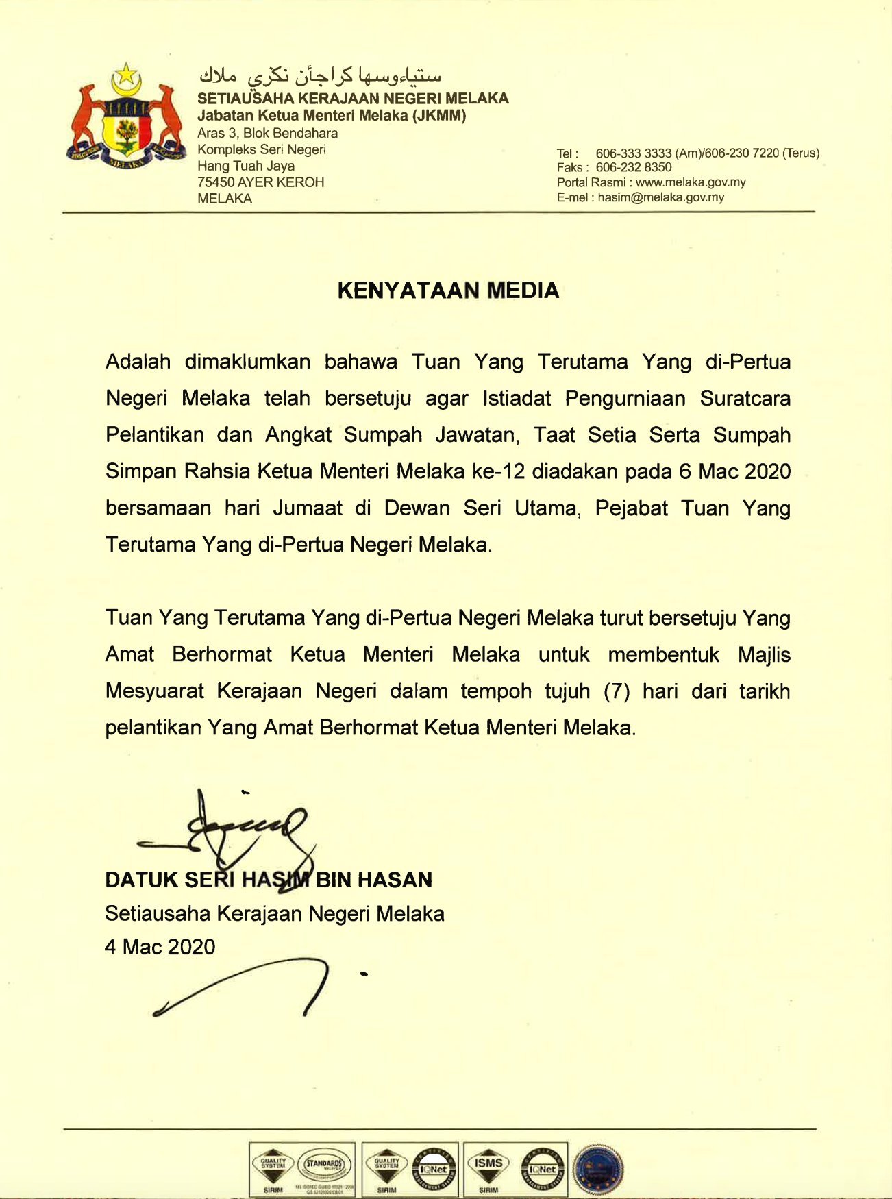 Bernama Tv Di Twitter Yang Dipertua Negeri Melaka Setuju Ketua Menteri Baharu Angkat Sumpah Jumaat Ini Suk