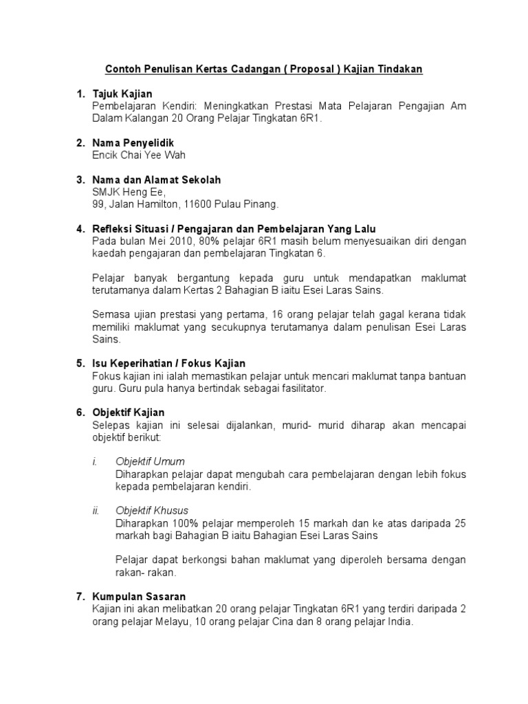 Kertas Cadangan Kajian Tindakan Contoh