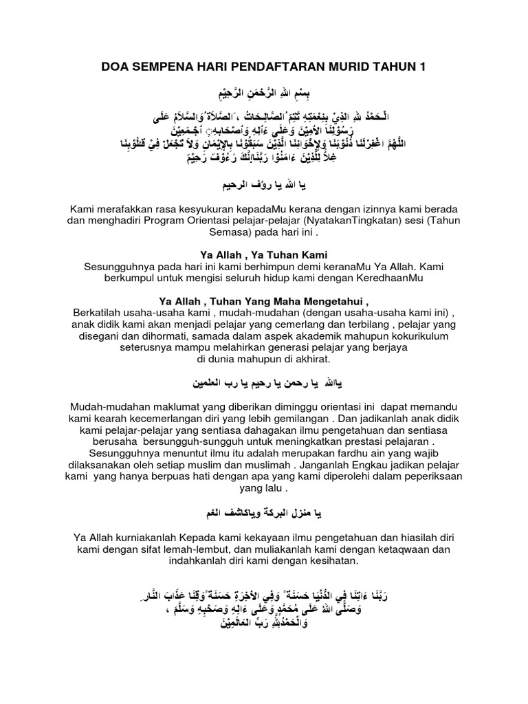 Doa Sempena Hari Pendaftaran Murid Tahun 1