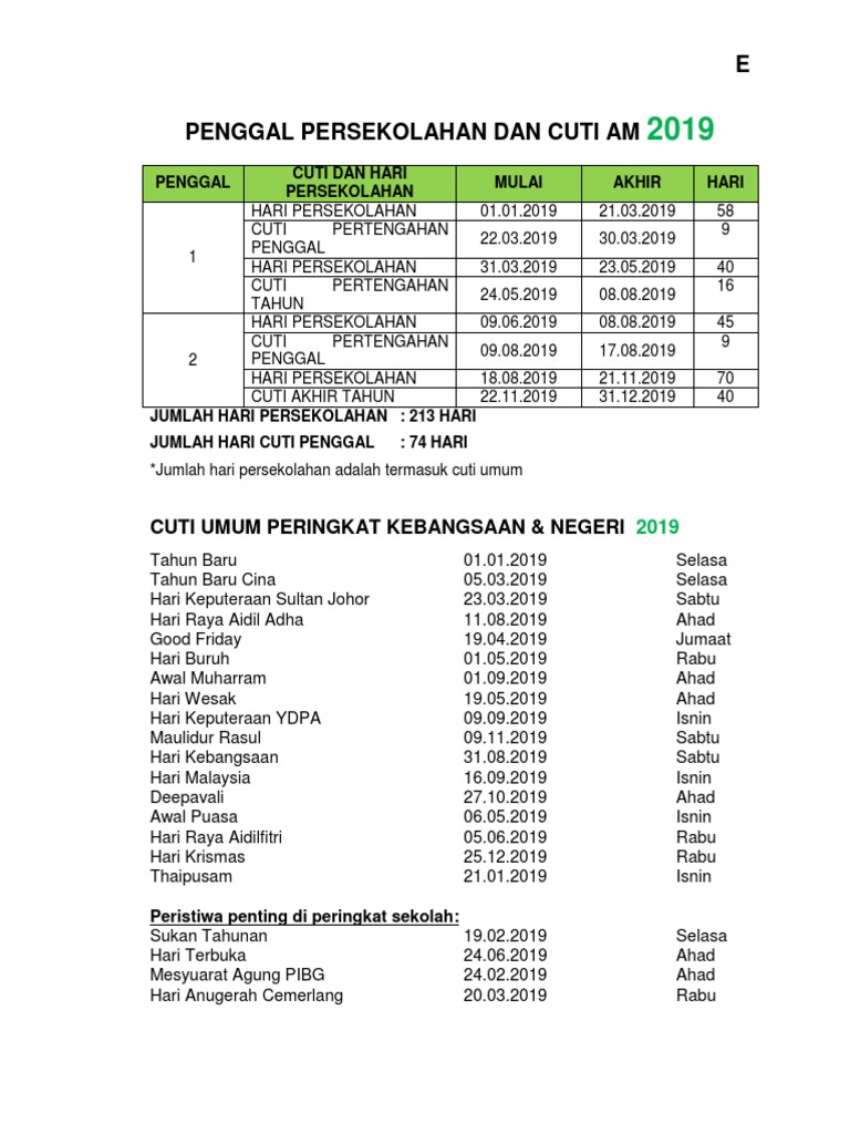 Penggal Persekolahan Dan Cuti Am 2019